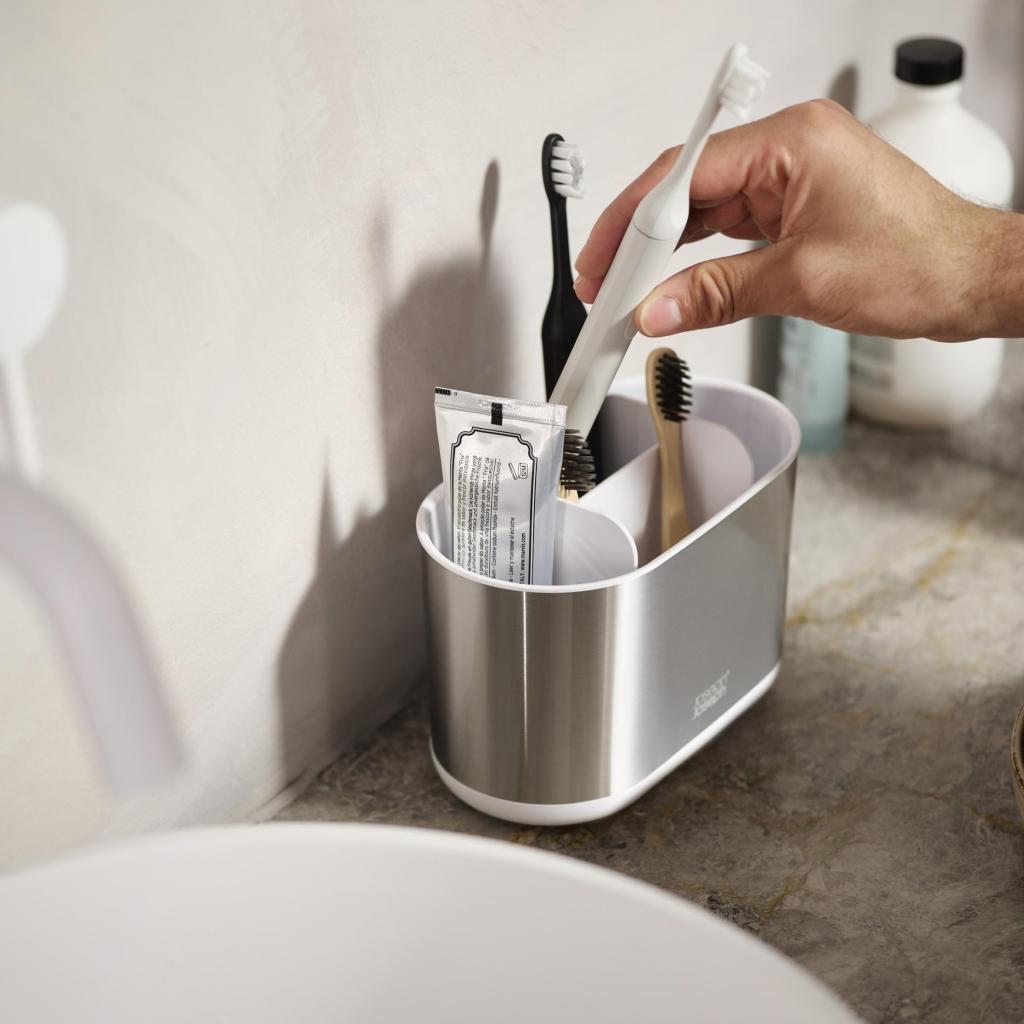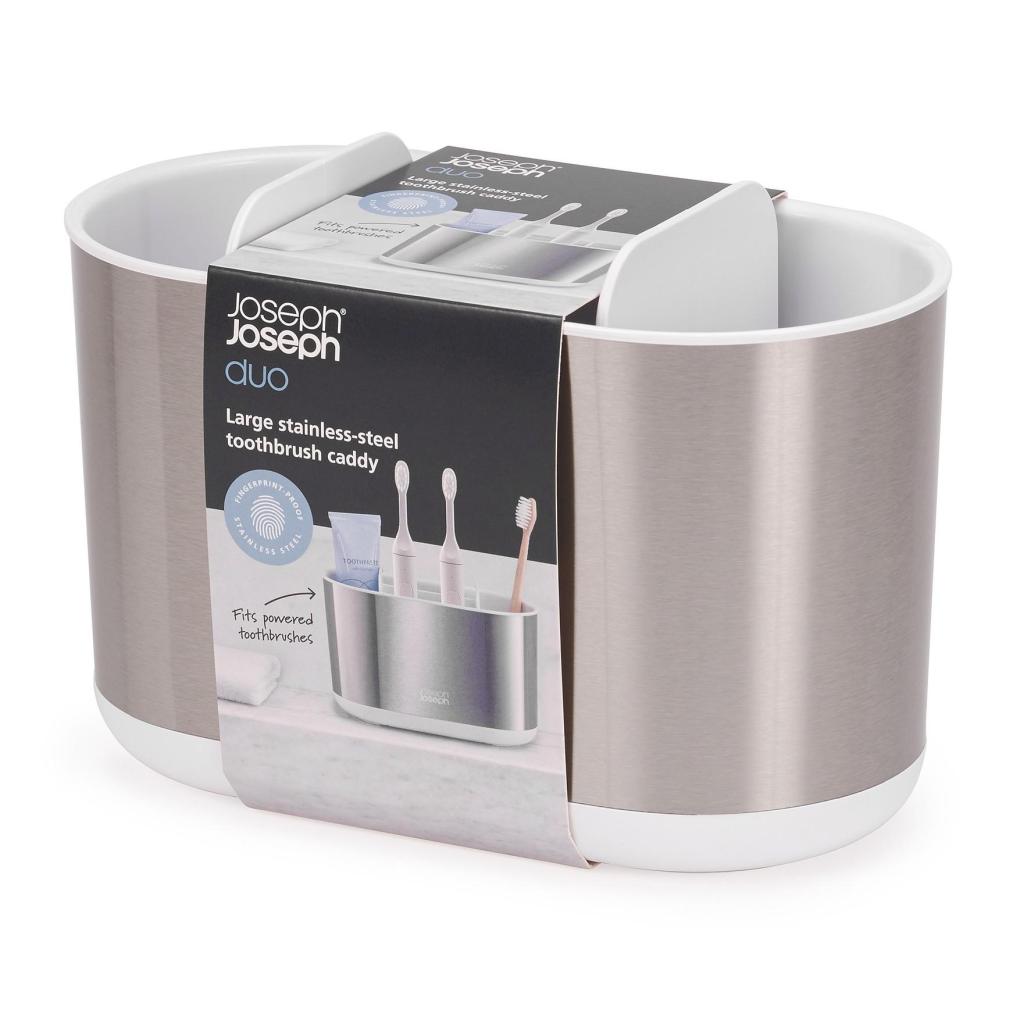 - Поставката за четка за зъби Joseph Joseph DUO STEEL предлага щедро и ясно структурирано пространство за ежедневна орална хигиена за цялото семейство.