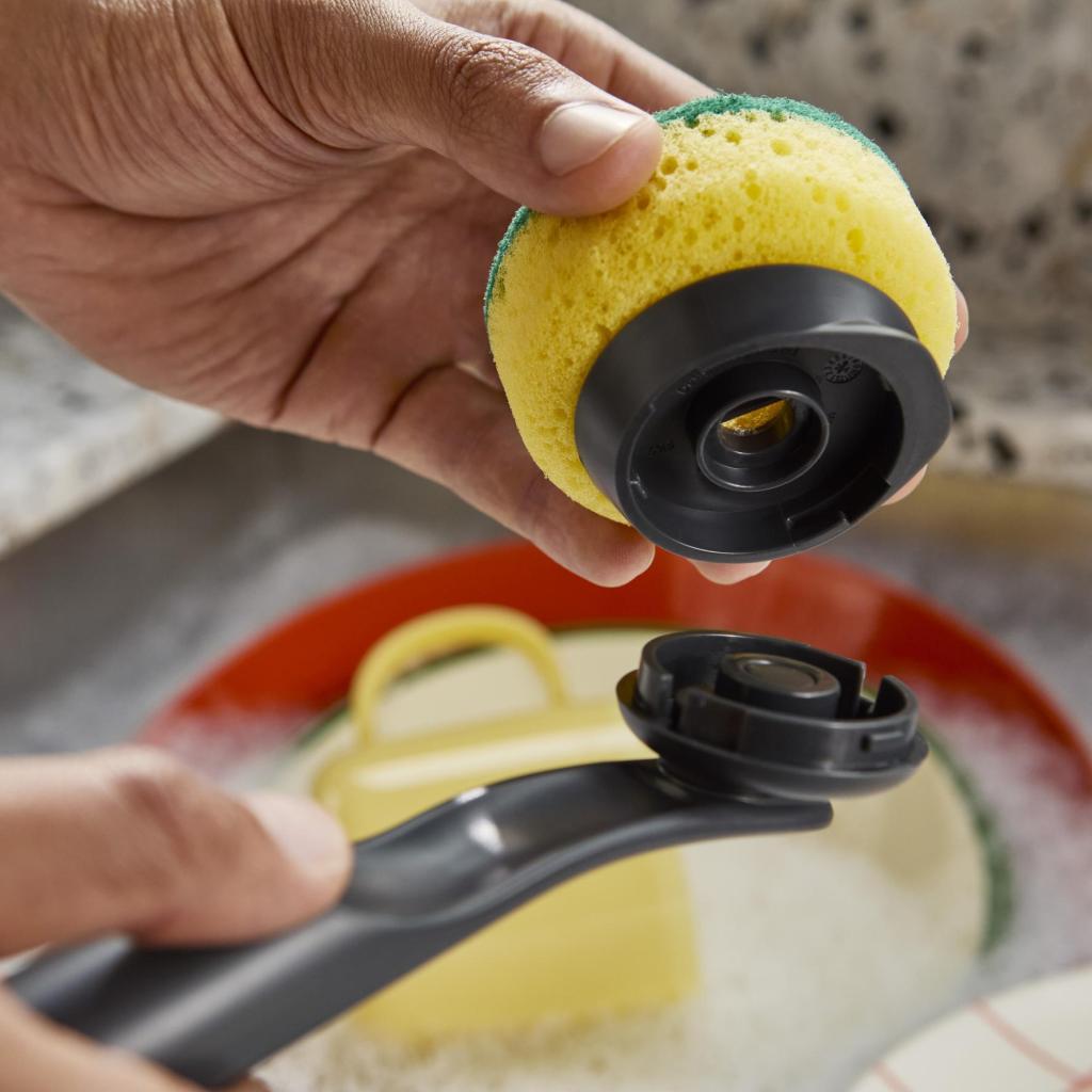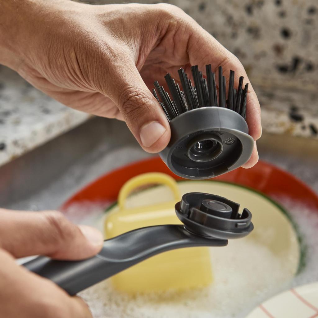 Понякога е достатъчен само един правилен инструмент и мивката вече няма да изглежда като място на последна съпротива. Тази четка има сменяема глава, така че когато косъмчетата си свършат работата, просто ги заменете с нова. По-малко отпадъци, по-малко извинения, повече чисти чинии.