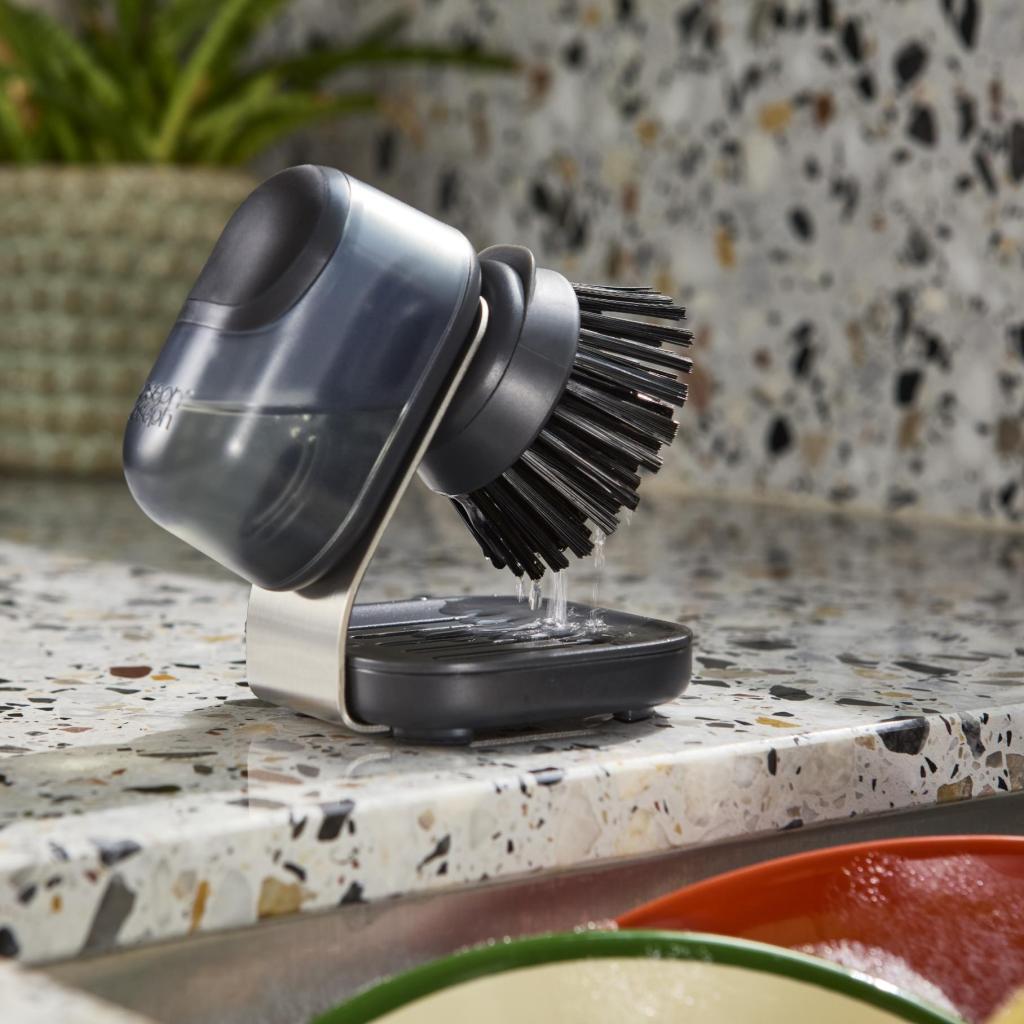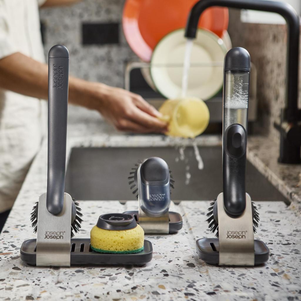 - Компактната четка SINKTECH с дозатор за препарат и поставка осигурява бързо и удобно миене на съдове с чисто и подредено пространство около мивката.