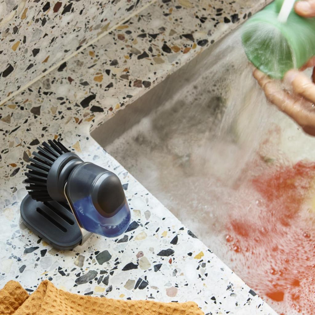 - Пакетът включва компактна четка с дозатор за препарат и поставка от неръждаема стомана с тава за отцеждане, като резервните глави се продават отделно.
