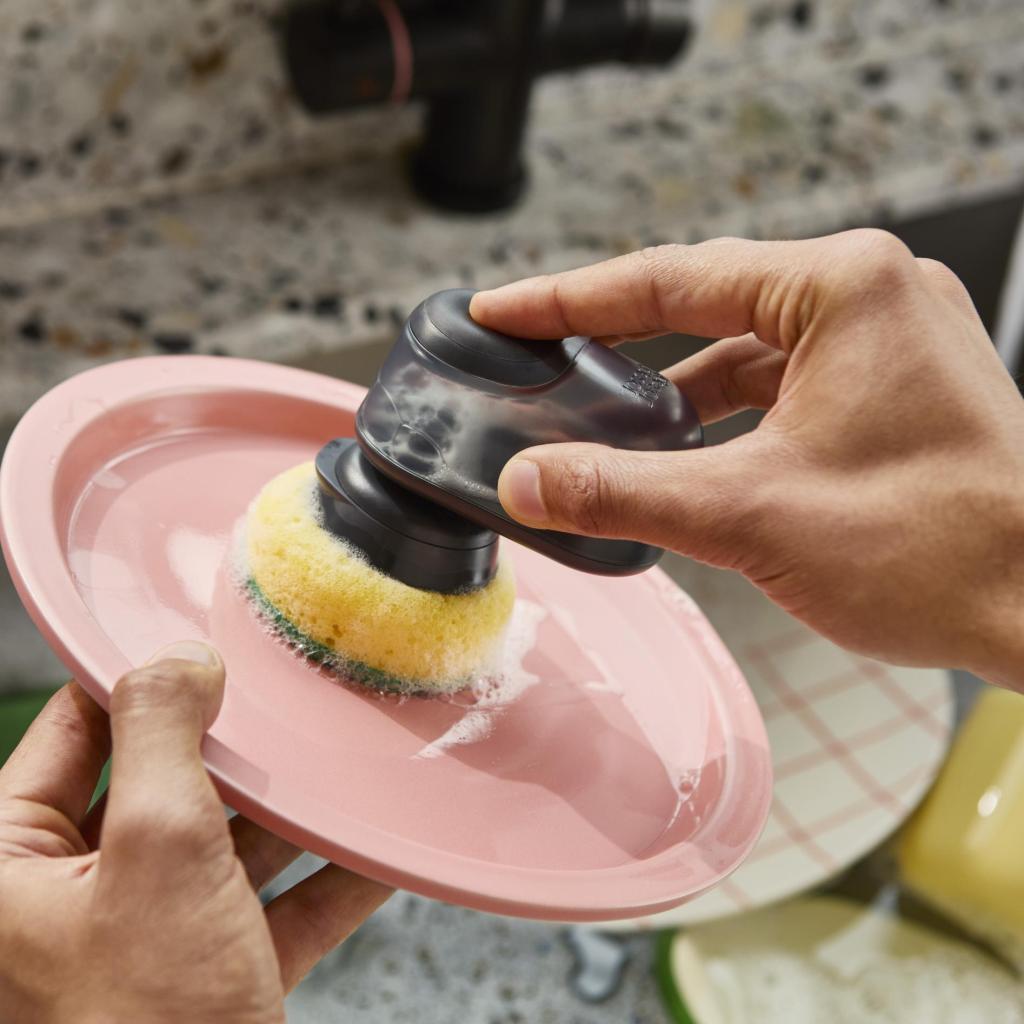 Засъхналата чиния след вечеря може да бъде упорит противник, но дозаторът за препарат директно в дръжката променя правилата на играта. Без прекъсване на работа, без търсене на бутилка. Просто натиснете и продължете, сякаш току-що сте открили ускорен режим за миене на съдове.