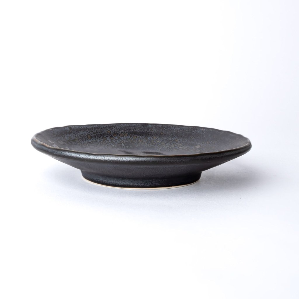 Понякога една малка чиния е достатъчна, за да покаже, че дори едно малко нещо може да има индивидуалност. Тази изглежда така, сякаш носи спомен за нощното небе след дъжд в глазурата - тъмна, неравномерна, с фини отблясъци. Когато сложите парче шоколад или мини десерт върху него, за миг усещате, че неочаквано сте спечелили от лотарията на добрия вкус. И все пак това е само един обикновен момент, който този дизайн може да издигне на следващото ниво.