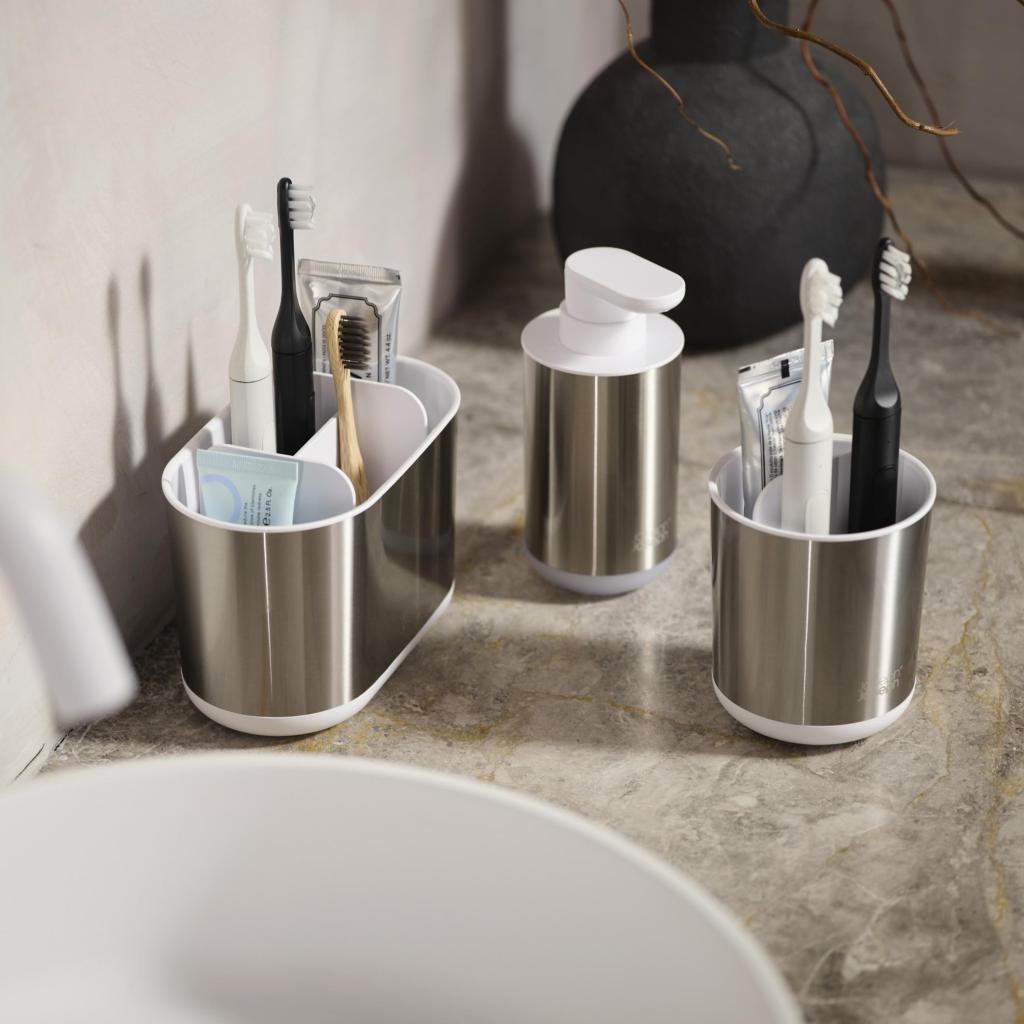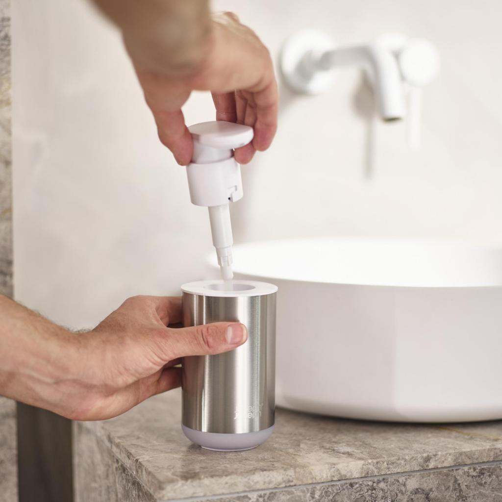 - Дозатори за сапун Joseph Joseph DUO 70608 в комбинация от неръждаема стомана и бял предлага елегантно и модерно решение за всяка баня или тоалетна.