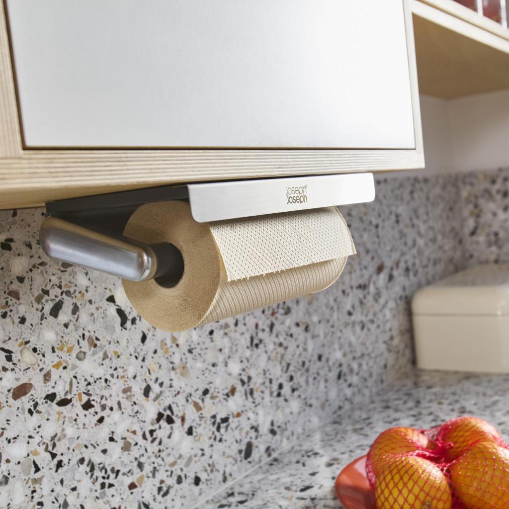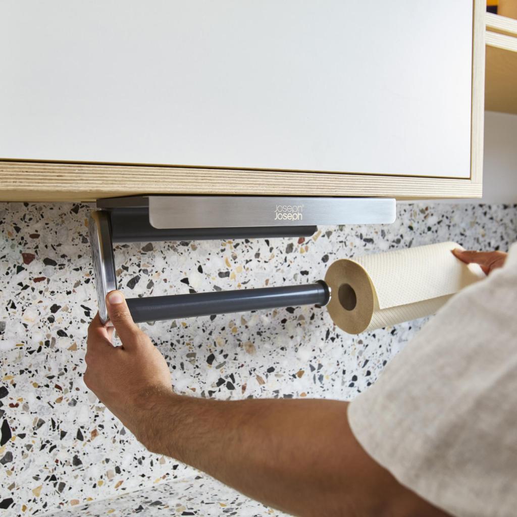 - Държач за хартиени кърпи от неръждаема стомана ROLLGRIP е практично решение за освобождаване на работната повърхност и подредено съхранение на кухненски ролки директно под горния шкаф.