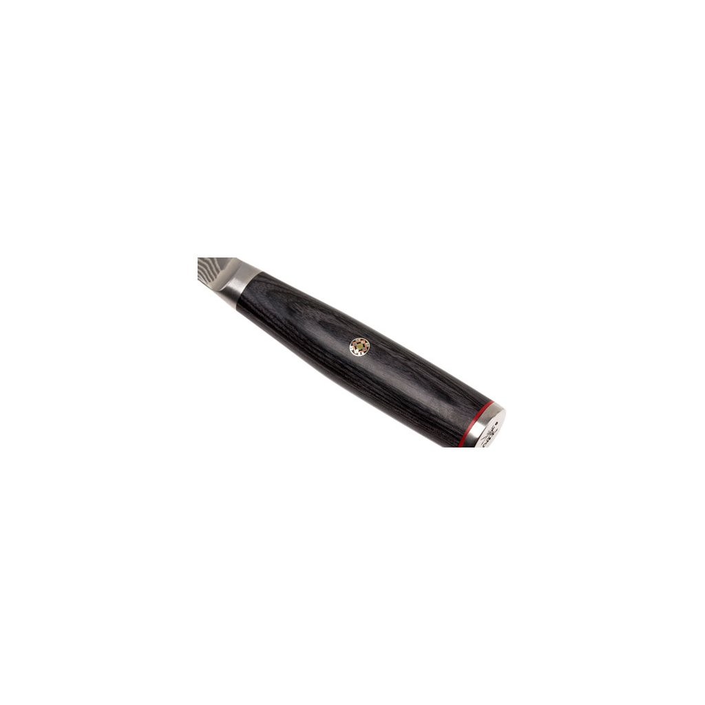 Г-образната дръжка осигурява перфектен контрол на рязането и ефективна опора по време на рязане. Здравата дръжка, изработена от екзотичното дърво Cocobolo Pakka, е не само перфектно балансирана , но и стабилна по размер. Тъмният нюанс на дървото оставя впечатление за лукс. Елегантността на тъмната дръжка се подчертава от изисканите декоративни елементи. Хубавата декоративна линия е запълнена с червен цвят, което в Япония символизира страст, искреност и ентусиазъм. Финият детайл под формата на мозаечен щифт и основа от неръждаема стомана с лого, ще илюстрират атмосферата на Далечния изток. Перфектният баланс на ножа осигурява комфорт и предотвратява умората на ръката. Ножовете MIYABI 5000FCD ще задоволят напълно желанието ви за прецизен инструмент с японски произход.