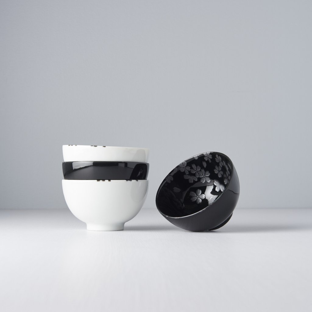 Комплектът включва 2 лъскави купи бял с листа от японска череша черен и 2 лъскави купи черен с листа от сакура сребърен . Листата са ръчно рисувани. Този комплект се предлага в елегантна подаръчна кутия черени следователно е подходящ за подарък за приятели или бизнес партньори.
