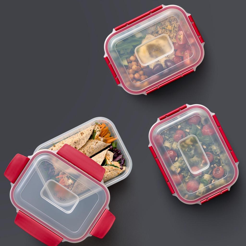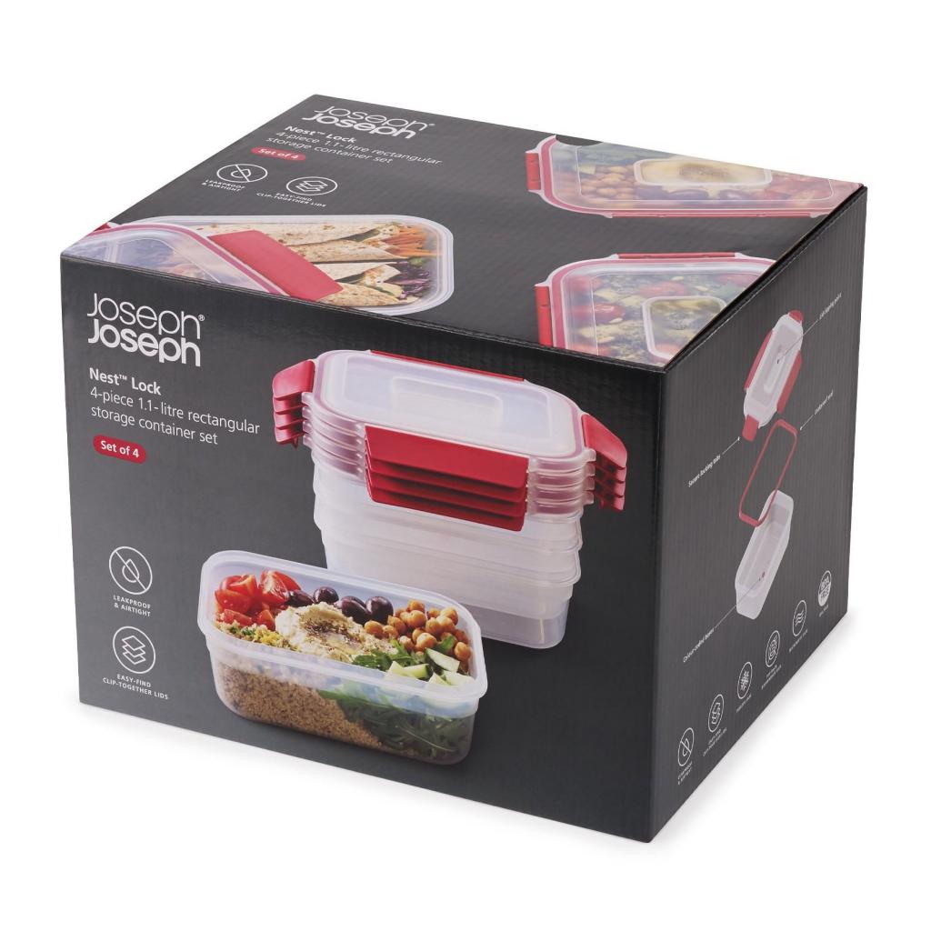 - Комплектът Joseph Joseph NEST LOCK за съхранение на храна съдържа 4 контейнера с обем 1,1 литра, проектирани за ясно и спестяващо място съхранение на храна.
