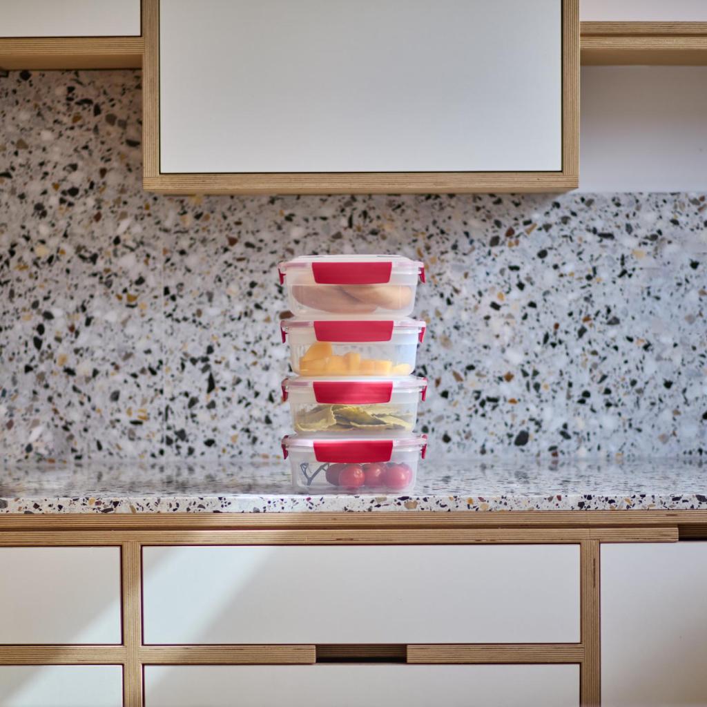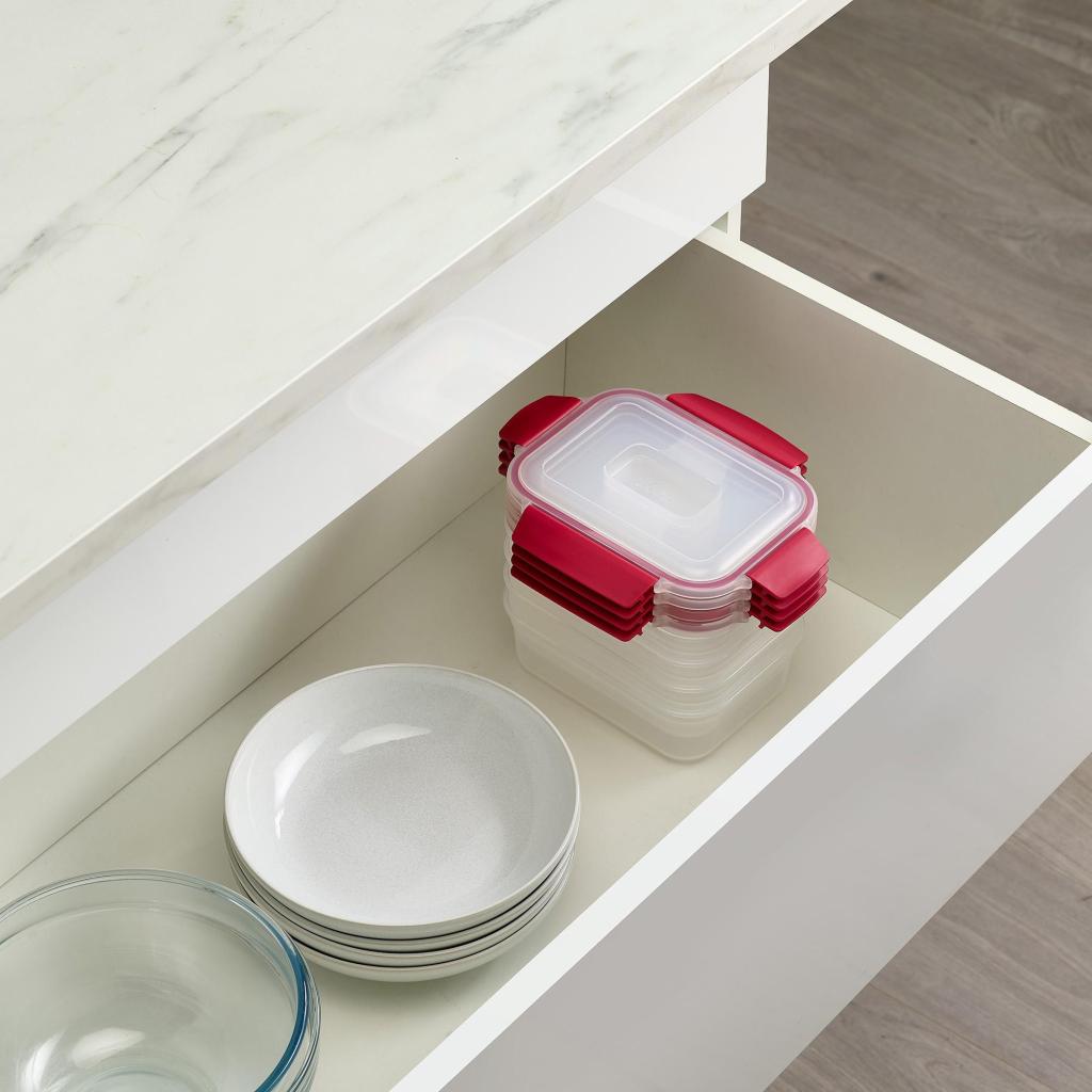 - Благодарение на интелигентния дизайн, контейнерите могат да се подреждат спретнато един в друг, което спестява място в шкафа и чекмеджето.