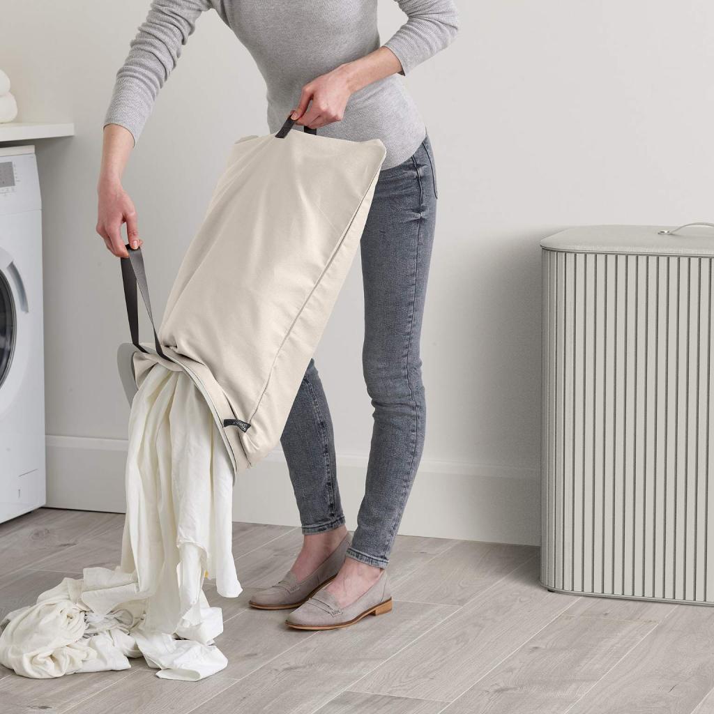 - Свалящите се текстилни торби със здрави дръжки позволяват удобно транспортиране на прането директно до пералната машина, без да е необходимо да носите цялата кошница.