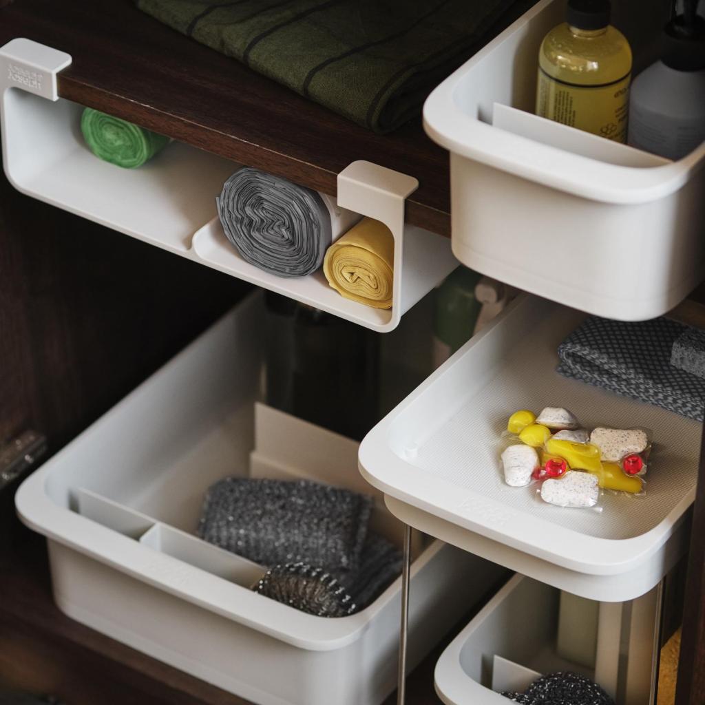 - Големият органайзер Joseph Joseph CUPBOARDSTORE осигурява подреденa система за съхранение на почистващи препарати в шкафа под мивката и помага всички помощни средства за почистване да бъдат на едно място.