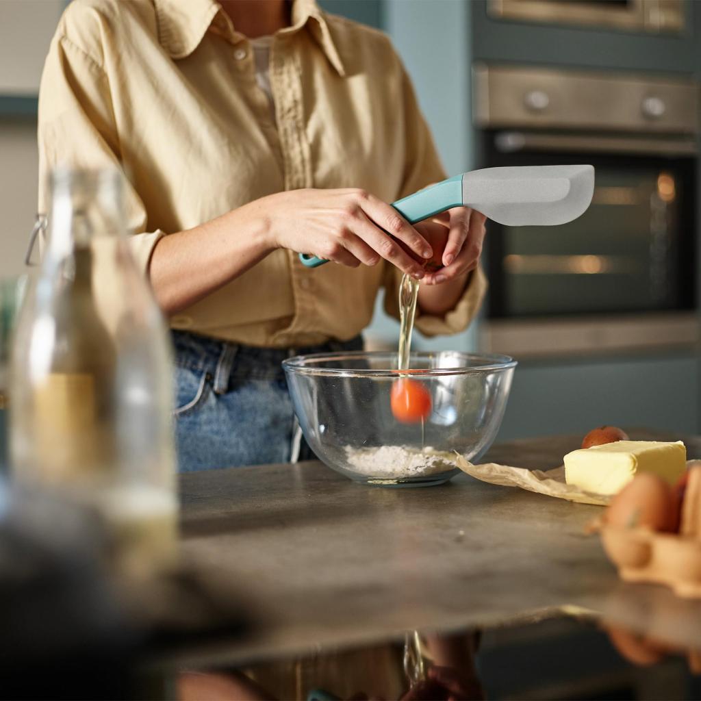 - Стесненият и гъвкав връх позволява прецизно изстъргване на сместа от ъглите на съдовете и краищата на форми за печене, без да уврежда повърхността.