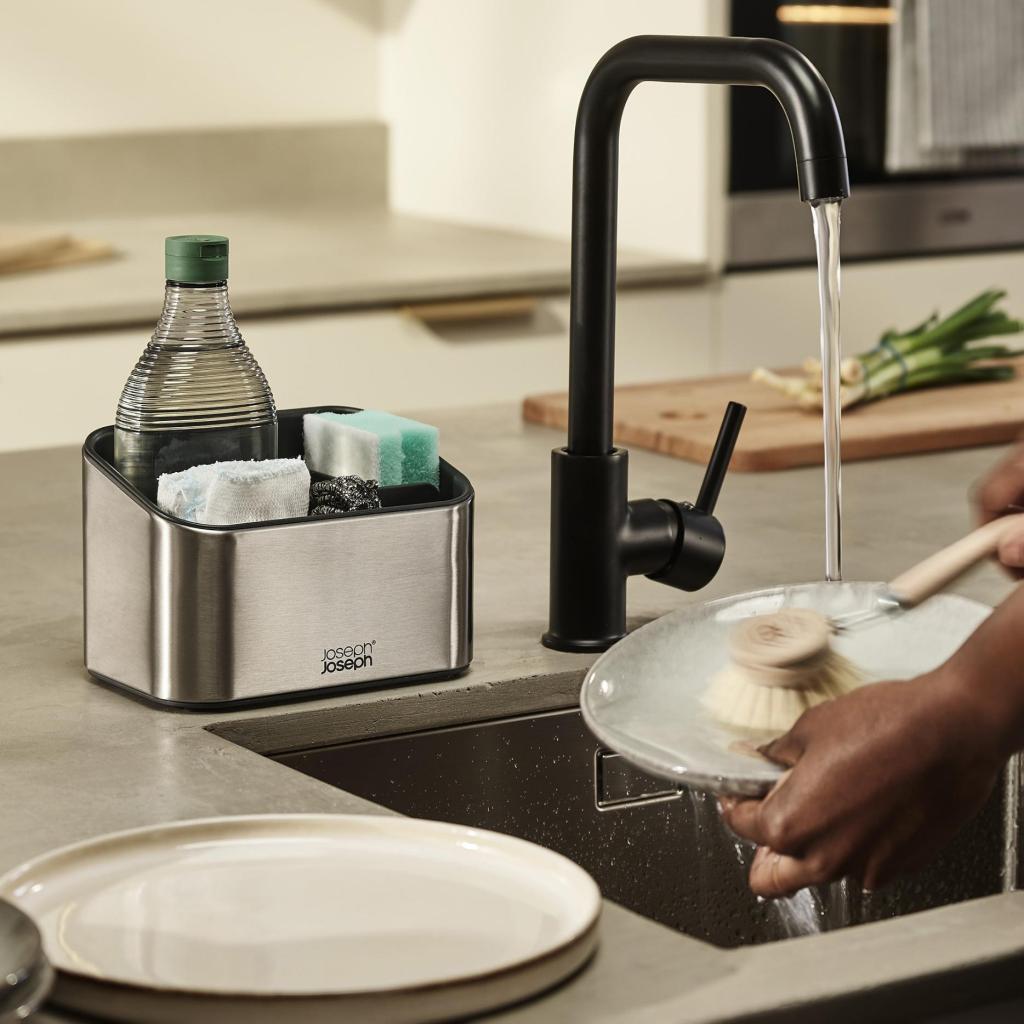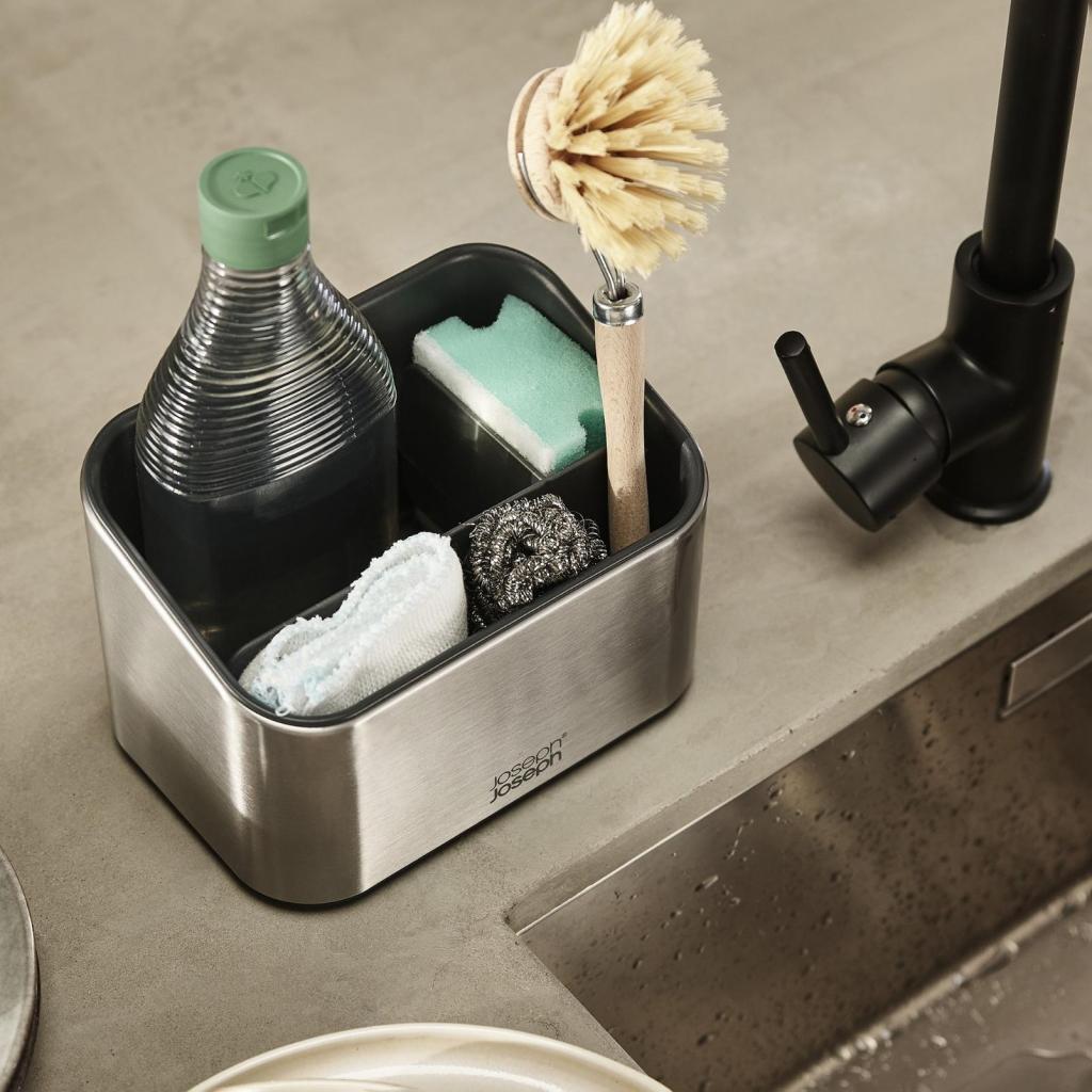 Има моменти, когато се чувствате край мивката като в малка лаборатория, пълна с гъби, четки и бутилки, които си пречат. Този органайзер от неръждаема стомана ще им придаде ясен ред и ще раздели отделните помощни средства така, че всяко да има своето място. Вместо импровизация, идва една проста система, която работи всеки ден.