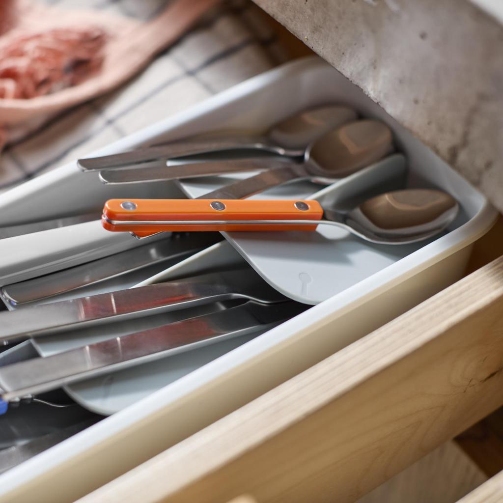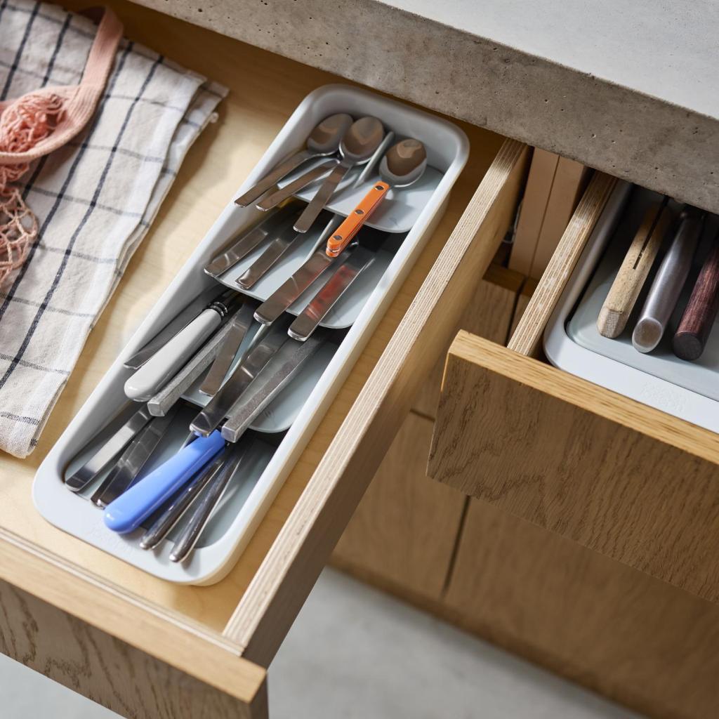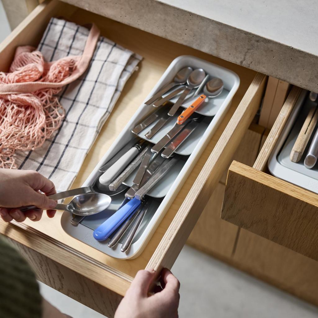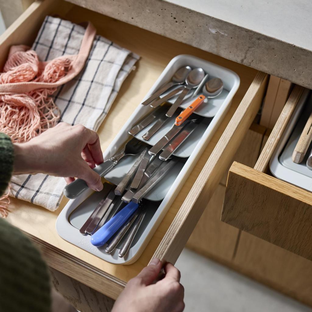 - Компактният органайзер за прибори Joseph Joseph DRAWERSTORE помага за подреждането на приборите дори в по-малки кухненски чекмеджета.