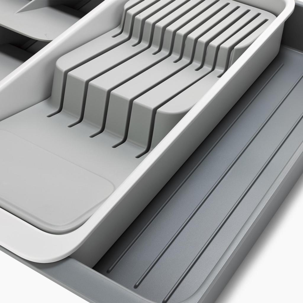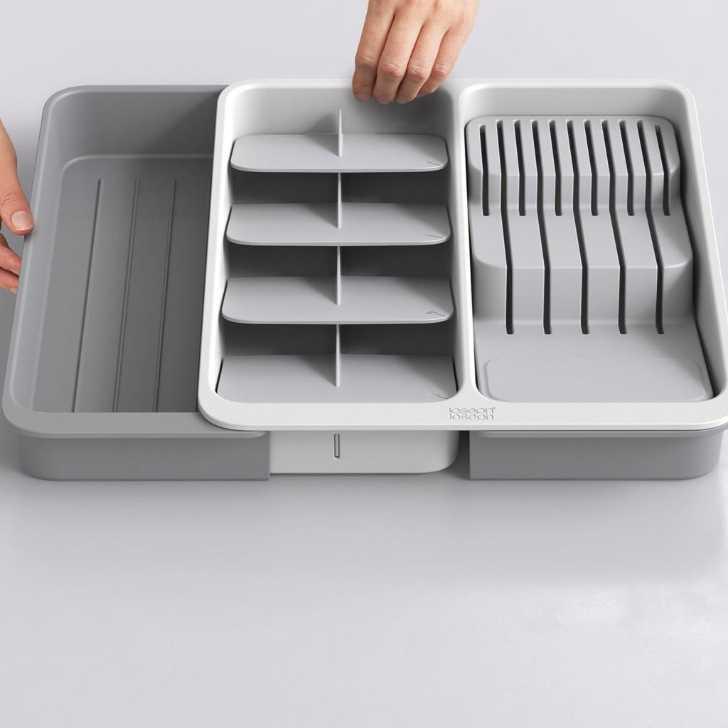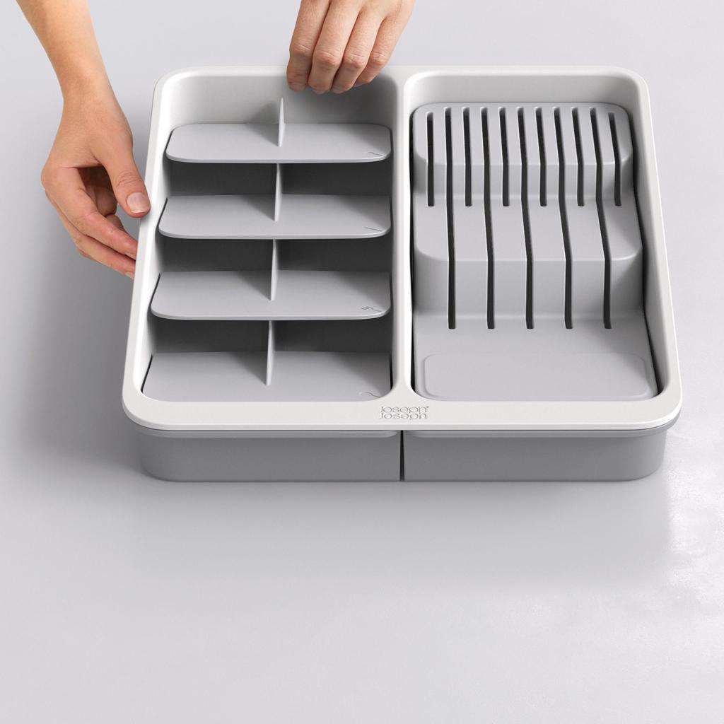 - Органайзер за чекмедже Joseph Joseph DRAWERSTORE помага за подреждането на прибори, ножове и прибори за готвене в кухненското чекмедже.