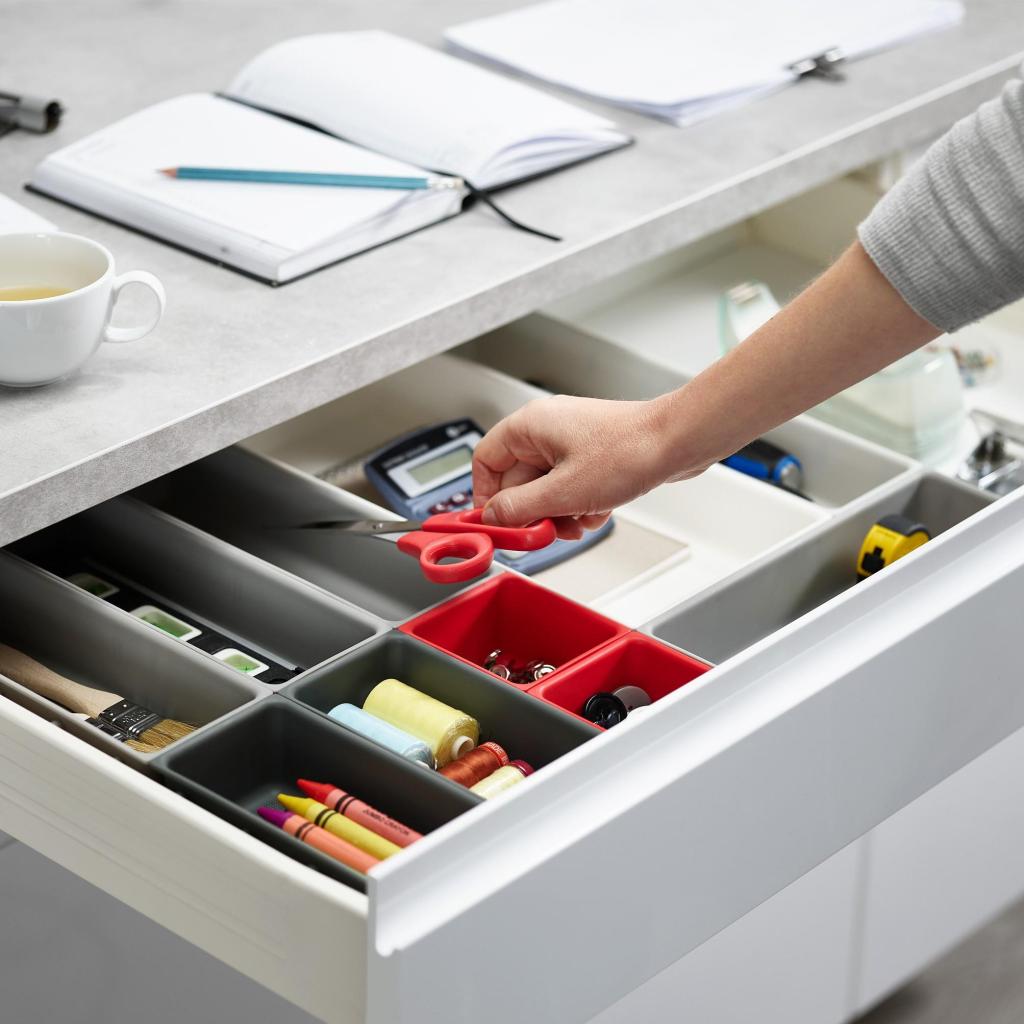 - Модулната система позволява оптимално запълване дори на нестандартни или по-широки чекмеджета и адаптиране на разпределението към актуалните нужди.