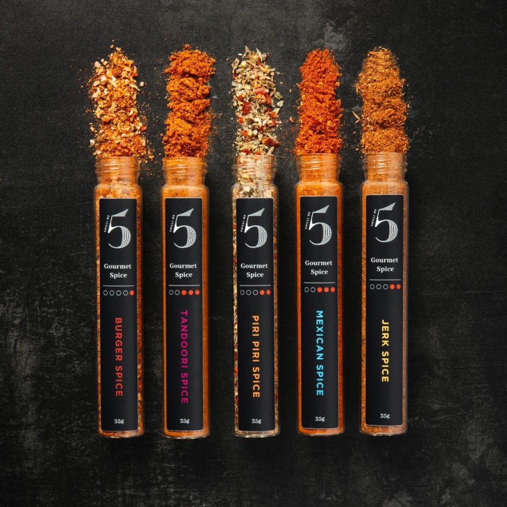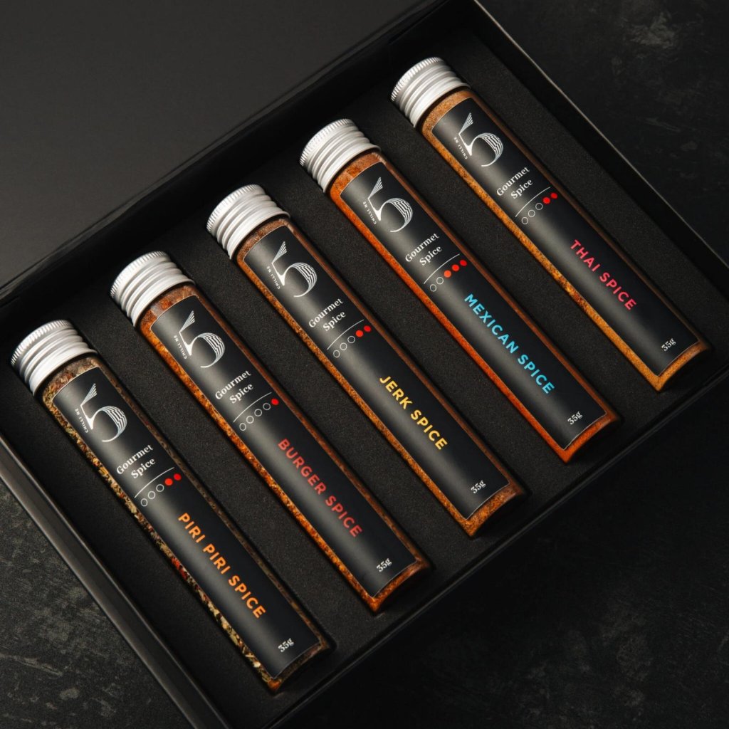 - Комплектът включва смеси от подправки Jerk Spice, Burger Spice, Thai Spice, Piri Piri Spice и Tandoori Spice, така че можете да се насладите на разнообразни вкусове - от опушени нотки до пикантни подправки.