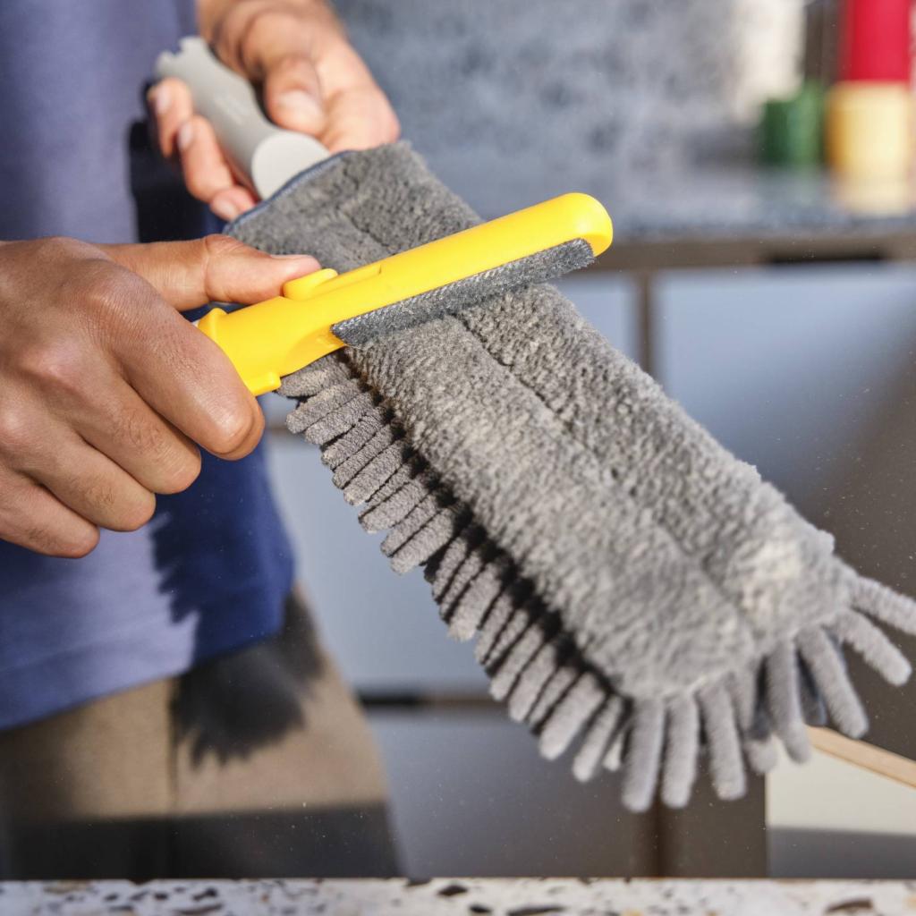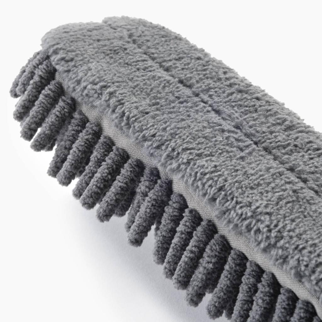 - Плътният текстил тип "юфка" ефективно улавя праха върху неравни повърхности, като декорации, рамки, корнизи и текстурирани материали.