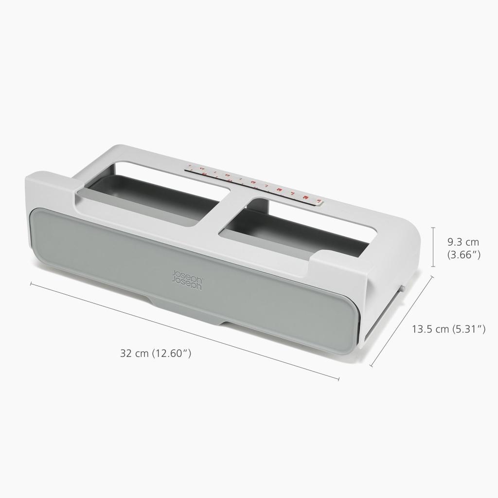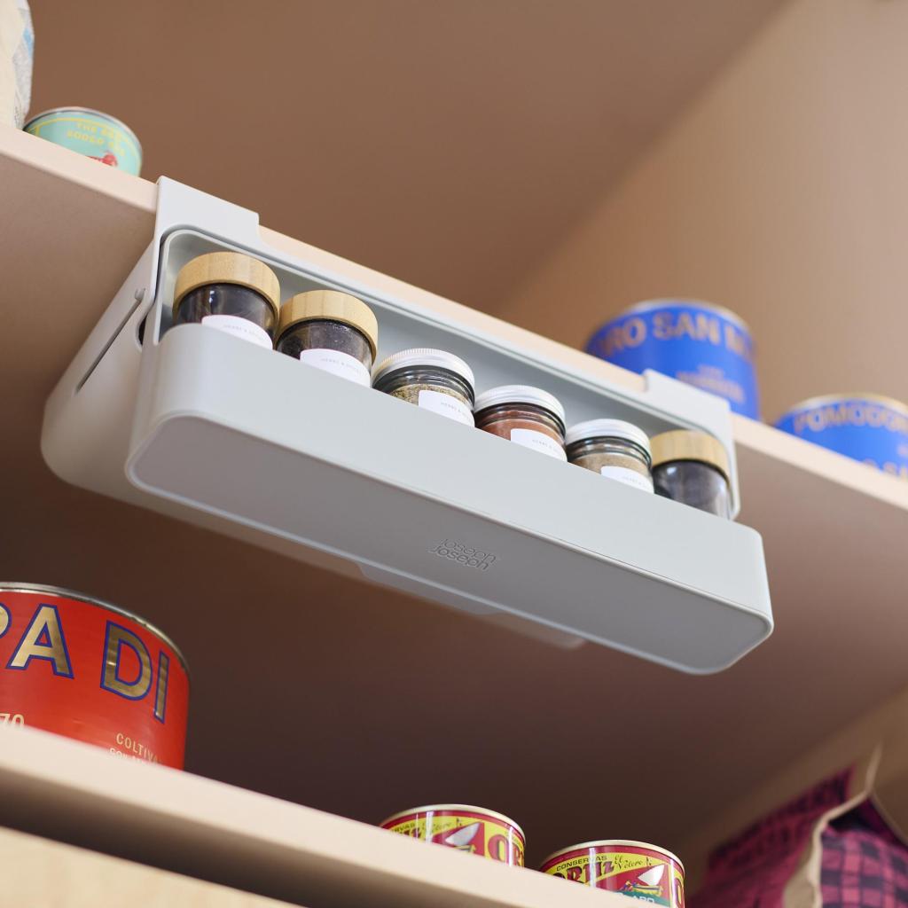 - Практичният държач за кутии за подправки Joseph Joseph CUPBOARDSTORE помага да се използва пространството под рафта в шкафа, което иначе често остава неизползвано, и го превръща в свободно място за съхранение на подправки.