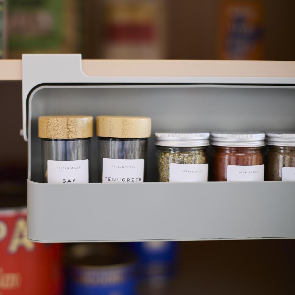 - Издърпващият се Шкафче държи кутии за подправки спретнато организиран, като същевременно гарантира, че нищо няма да падне или да се преобърне при отваряне.