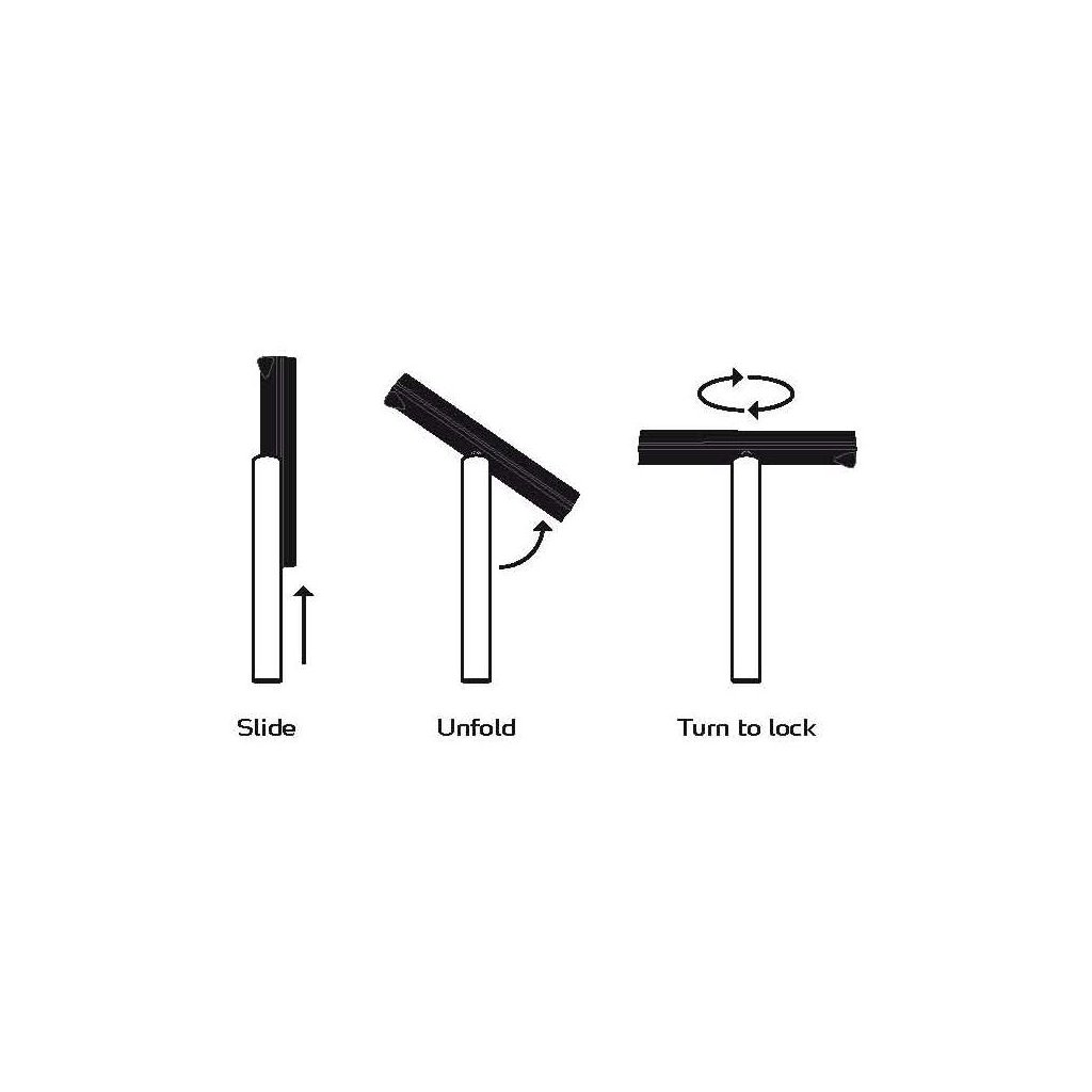 Механизмът за сгъване е прост: Пластмасовото острие на стъргалката стандартно е поставено в дръжка от неръждаема стомана. За да използвате стъргалката, хванете дръжката, а с другата ръка издърпайте острието на стъргалката, така че да е перпендикулярно на дръжката. След това завъртете дръжката обратно на часовниковата стрелка, за да фиксирате острието в позиция.