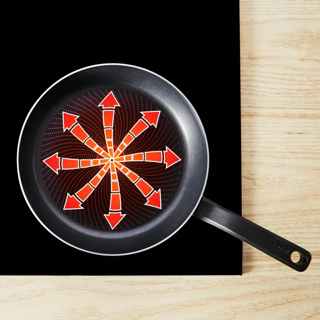 - Вграденият индикатор Thermo-Signal™ променя цвета си и се затопля напълно на червен , когато тиганът достигне идеалната температура за започване на готвене.