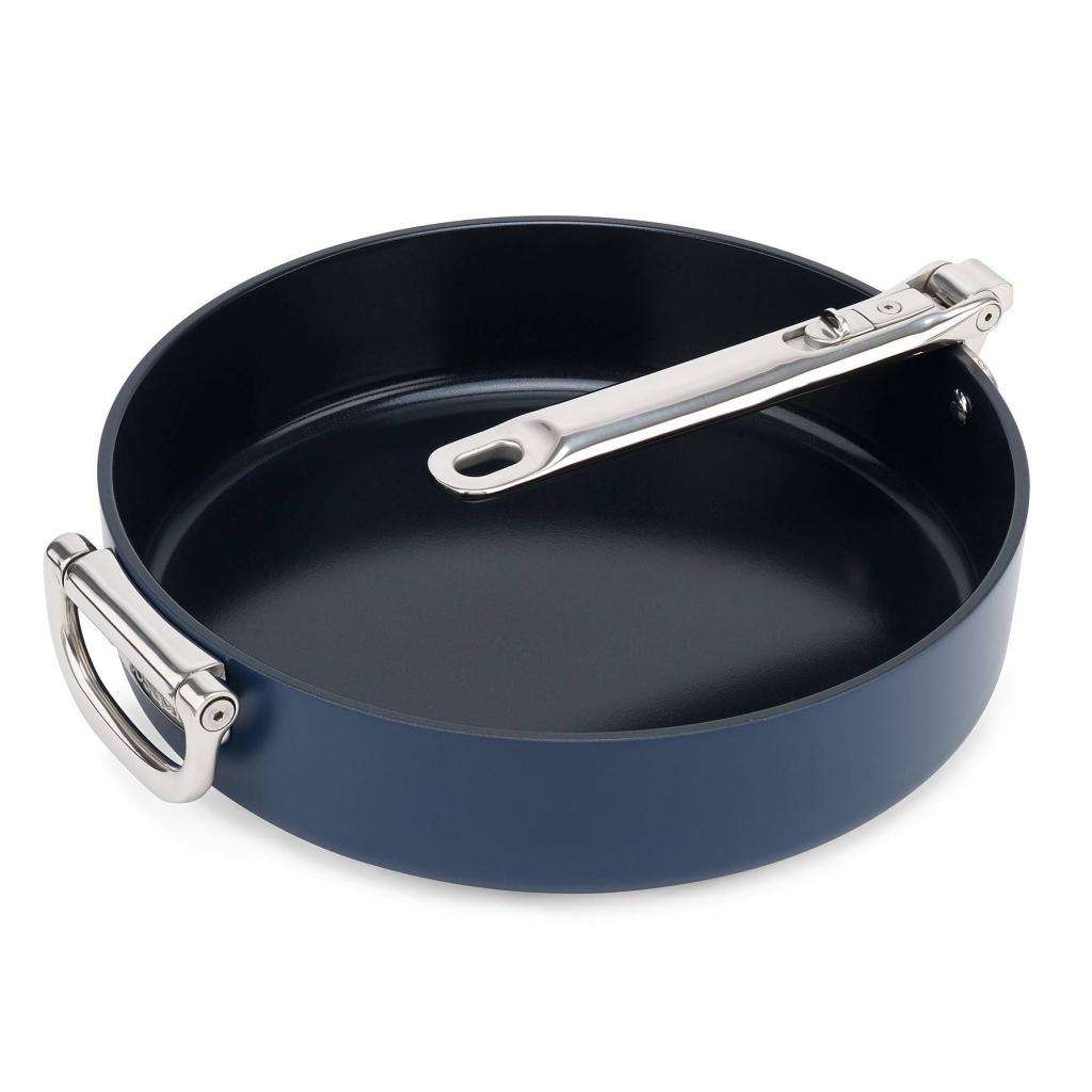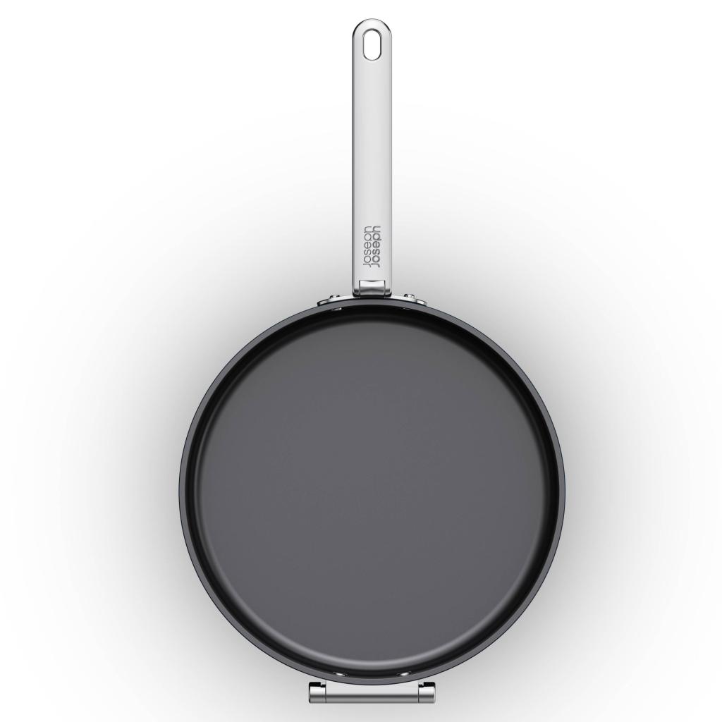 - Благодарение на механизма за сгъване тиганът може лесно да се подрежда с други съдове, което значително улеснява подреждането на кухненските шкафове.