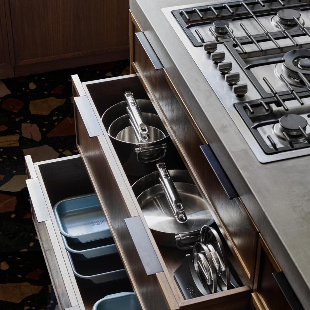 Кухненски съдове, които разбират реалностите на съвременната кухня - Joseph Joseph SPACE. По време на готвене той стои здраво и стабилно, готов да се справи с всичко - от бърза закуска до импровизирана вечеря. Но когато дойде време за почистване, тя променя характера си и дискретно се адаптира към пространството, без да заема повече място, отколкото е абсолютно необходимо. Какво повече можете да искате?