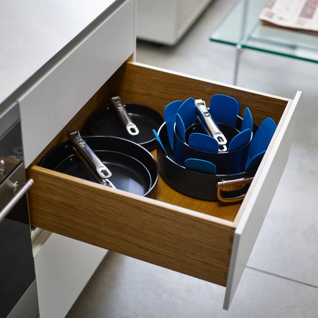 - Комплектът включва и две защитни подложки филц , които предпазват незалепващата повърхност при подреждане на отделни съдове за готвене.