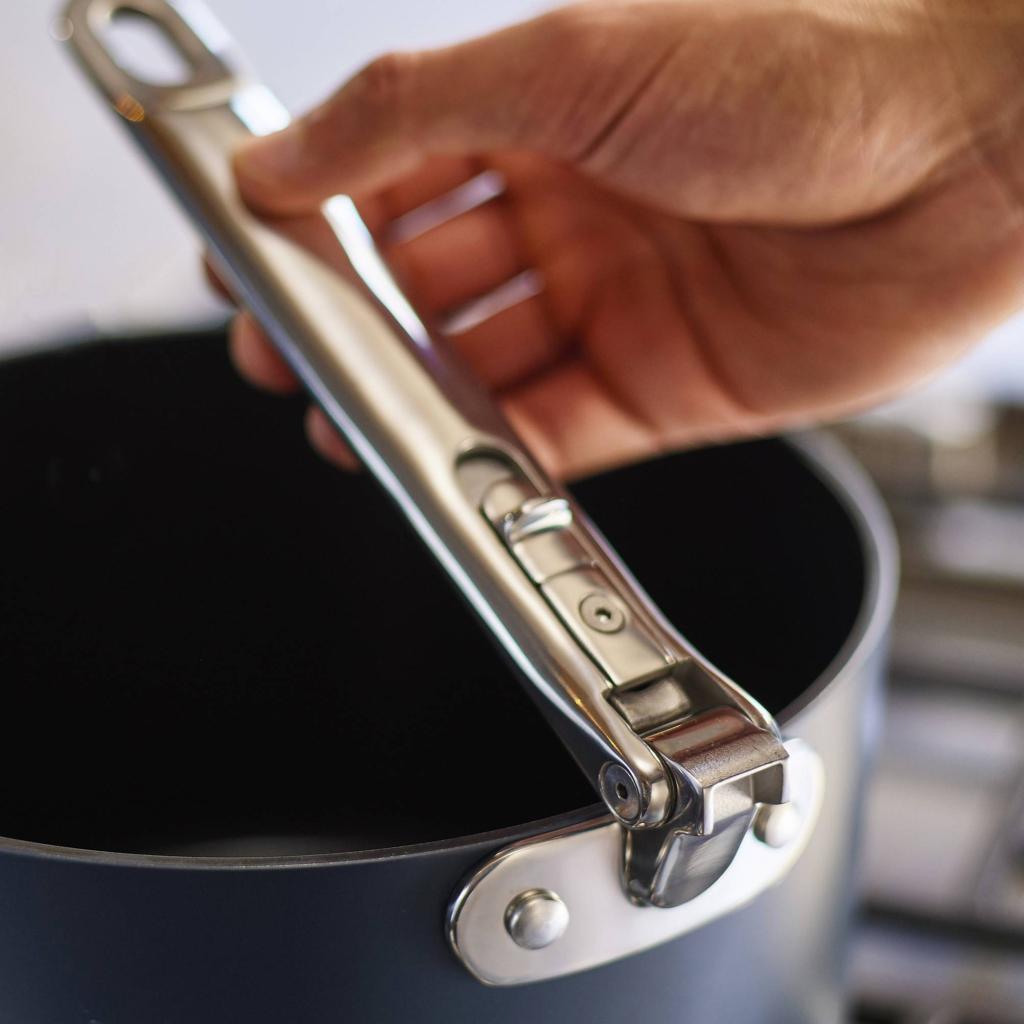 - Благодарение на сгъваемите дръжки тенджерите могат лесно да се подреждат една върху друга, като спестяват до 50% повече място за съхранение в сравнение с обикновените съдове.