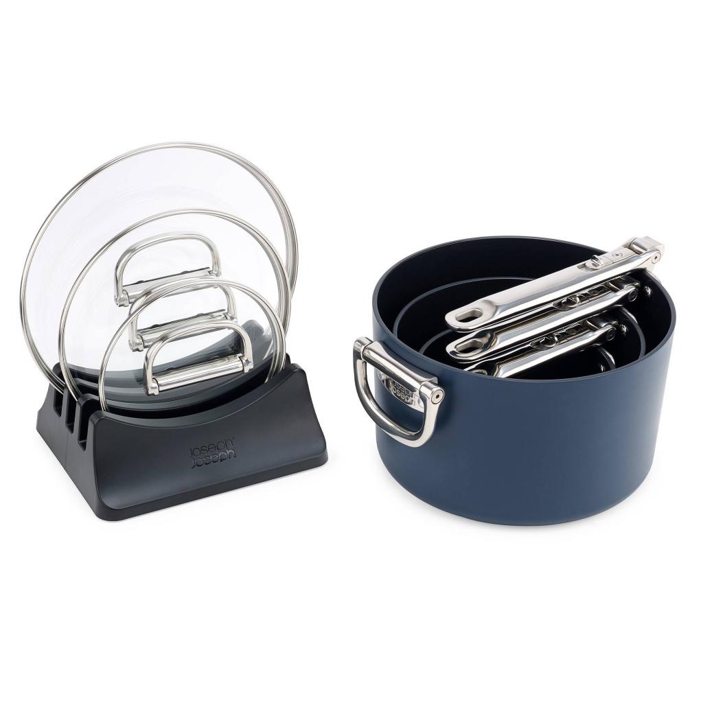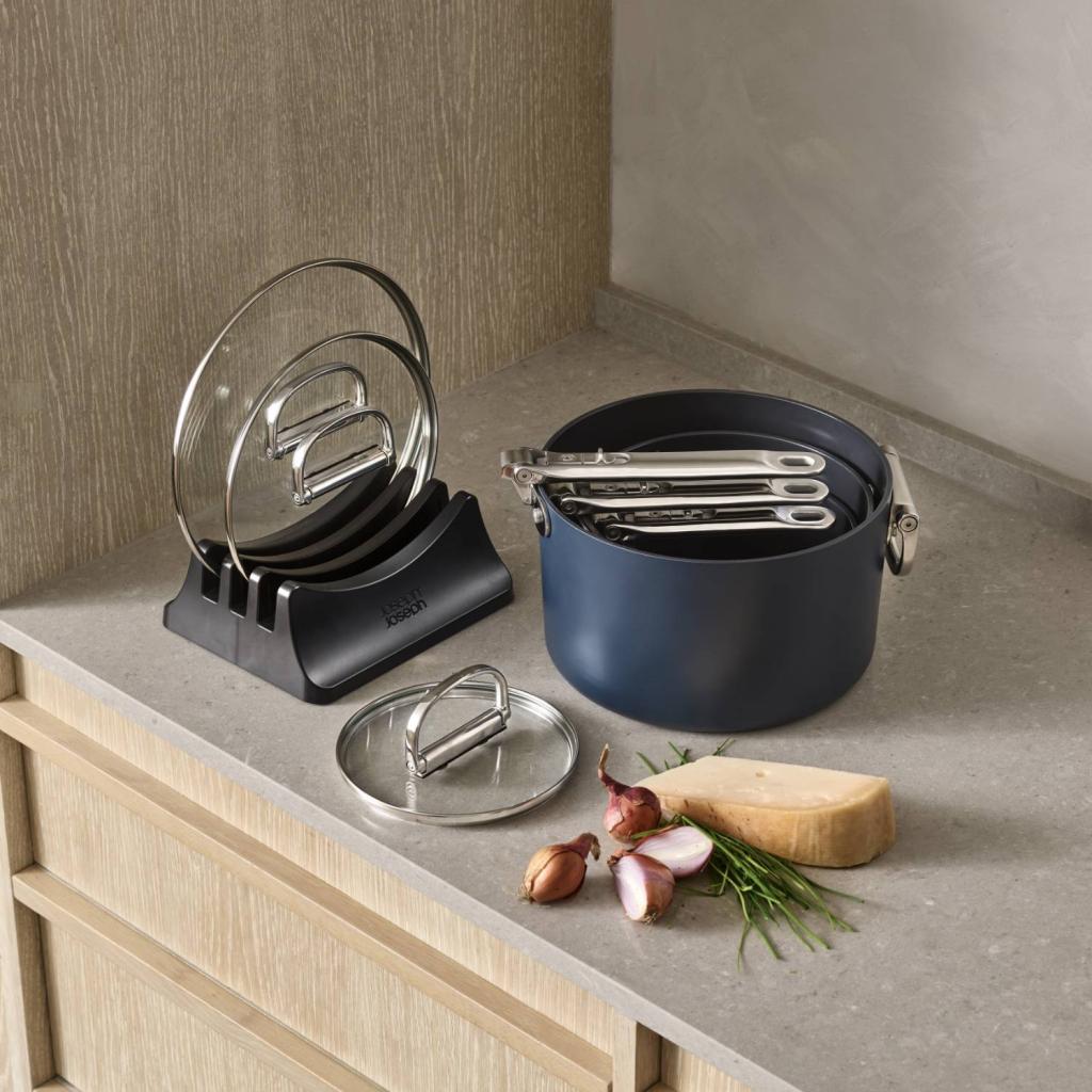 - Пакетът включва стойка за три капак за тенджера, която осигурява тяхното ясно и компактно съхранение в кухненски шкаф.
