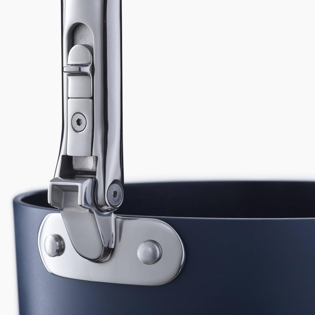 - И двете дръжки са сгъваеми, така че тиган за сосове може лесно да се подрежда с други прибори и ефективно да използва пространството за съхранение в кухненските шкафове.