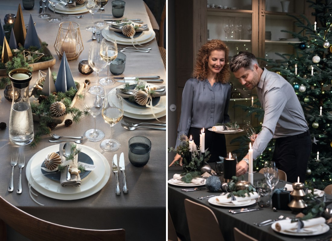 Придайте на сиво-синята комбинация истински празничен и луксозен вид, като добавите няколко златни или сребърни елемента. С украшения, прибори за хранене или орнаменти на елхата.